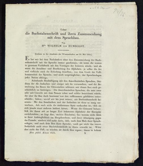 - TitelÜber die Buchstabenschrift und ihren Zusammenhang mit dem Sprachbau : Gelesen in der Akademie der Wissenschaften am 20. Mai 1824 / Wilhelm von Humboldt