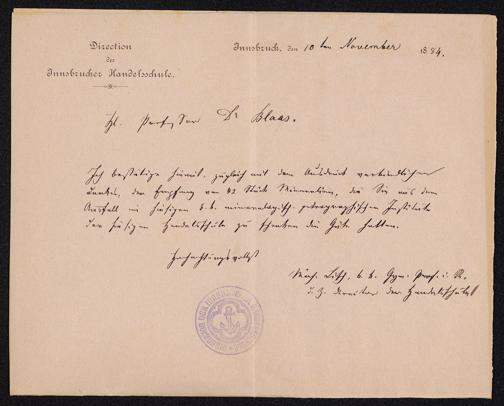 [Brief Direktion der Handelsschule an Josef Blaas]