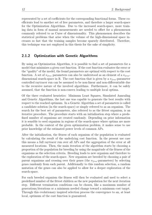 12 2. Backgroundrepresented by a set of coefficients for the corresponding functional forms. These co-efficients lead to another set of free parameters, and therefore a larger search-spacefor the Optimization Algorithms. Due to the increased search-space, more train-ing data in form of manual measurements are needed to offset for a phenomenoncommonly referred to as Curse of dimensionality. This phenomenon describes thestatistical problems that arise when the volume of the high-dimensional space in-creases so fast that the training samples become sparsely distributed. Therefore,this technique was not employed in this thesis for the sake of simplicity.2.1.2 Optimization with Genetic AlgorithmsBy using an Optimization Algorithm, it is possible to find a set of parameters for amodel that minimizes a given cost function. If the cost function evaluates the error orthe"quality" of the model, the found parameters are optimal with respect to the costfunction. A set of nfreeparameters can also be understood as an element of a nfree-dimensional search-space inR. The cost function that is given by a nfree-parametercontrolled raytracer run can be assumed to be non-linear and non-differentiable dueto the recursive nature of the involved algorithms. Furthermore, it can be safelyassumed, that the function is non-convex leading to multiple local optima.Of the three evaluated heuristics: Minimum Least Squares, Simulated Annealingand Genetic Algorithms , the last one was capable to generate the best results withrespect to the reached optimum. In a Genetic Algorithm a set of parameters is calleda candidate solution(in the search-space) or simply referred to as an organism. Thesearch for the best set of parameters, also referred to as the fittest organism, is aniterative procedure. The procedure starts with an initialization step where a prede-fined number of organisms are created randomly. Depending on prior informationit is sensible to seed organism in regions of the search-space where optima are moreprobable. In the context of the given optimization problem, it makes sense to useprior knowledge of the estimated power levels of common APs.After the initialization, the fitness of each organism of the population is evaluatedby calculating the result of the underlying cost function. In the present use casethis means a full raytracer run over all APs and the aggregation of the error at allmeasured locations. Then, the main iteration of the algorithm starts by choosing aproportion of the population for breeding by using the magnitude of the fitness of theorganisms as the selection criteria. Breeding leads to new organism and therefore tothe exploration of the search-space. New organism are breeded by choosing a pair ofparent organisms and crossing over their genes(the nfree-parameters) by selectinggenes randomly from each parent. Additionally to this random selection, a randommutation of the genes can also be applied to allow for a deeper exploration of thesearch-space.For each breeded organism the fitness will then be evaluated and used to select apredefined number of the fittest children as the new population for the next iterationstep. Different termination conditions can be chosen, like a maximum number ofgenerations/iterations or a minimum needed change toward a minimum cost target.Through this evolutionary inspired selection process the convergence to an, at leastlocal, optimum of the cost function is guaranteed.