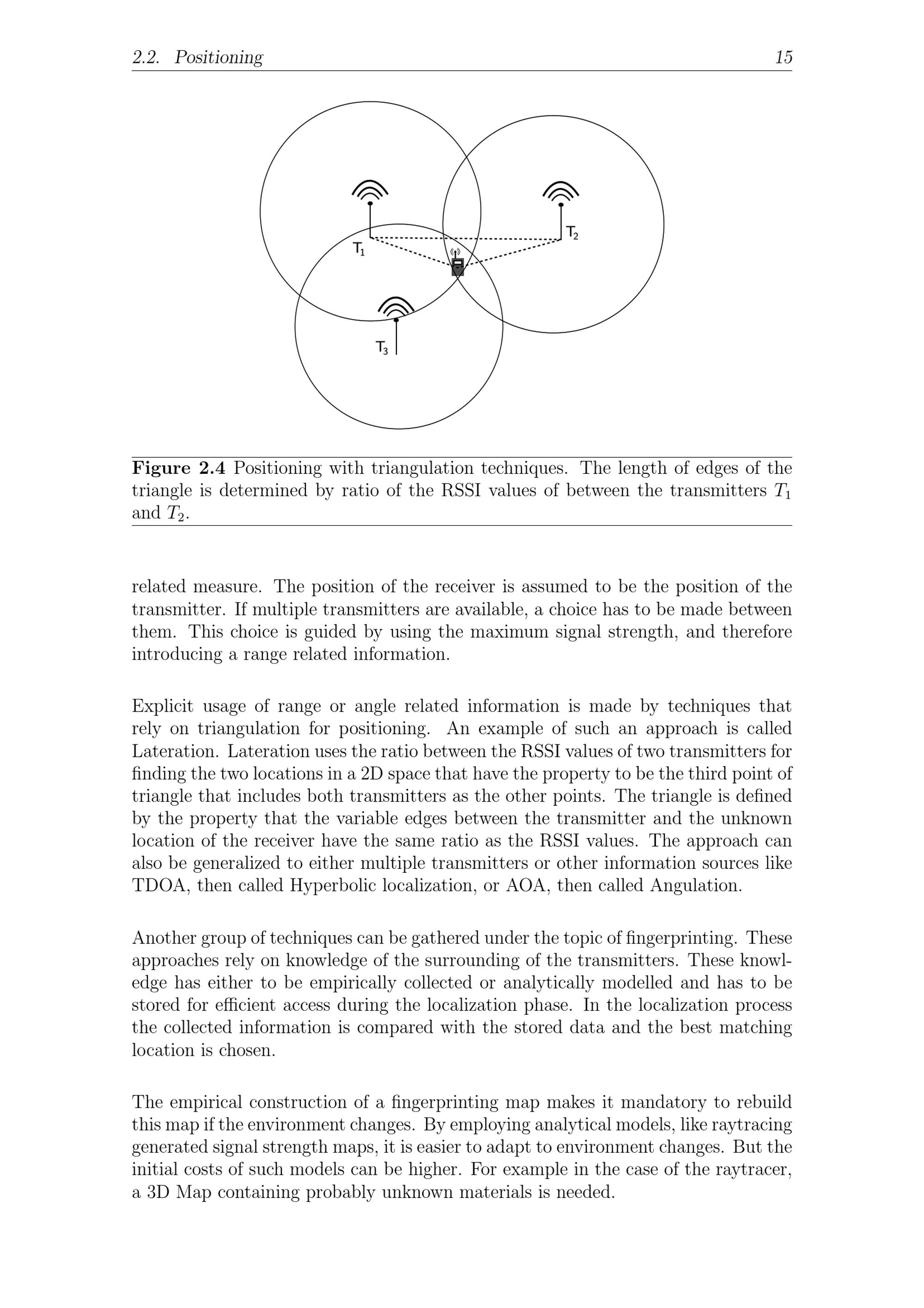 2.2. Positioning 15Figure 2.4 Positioning with triangulation techniques. The length of edges of thetriangle is determined by ratio of the RSSI values of between the transmitters T1and T2.related measure. The position of the receiver is assumed to be the position of thetransmitter. If multiple transmitters are available, a choice has to be made betweenthem. This choice is guided by using the maximum signal strength, and thereforeintroducing a range related information.Explicit usage of range or angle related information is made by techniques thatrely on triangulation for positioning. An example of such an approach is calledLateration . Lateration uses the ratio between the RSSI values of two transmitters forfinding the two locations in a 2D space that have the property to be the third point oftriangle that includes both transmitters as the other points. The triangle is definedby the property that the variable edges between the transmitter and the unknownlocation of the receiver have the same ratio as the RSSI values. The approach canalso be generalized to either multiple transmitters or other information sources likeTDOA, then called Hyperbolic localization, or AOA, then called Angulation.Another group of techniques can be gathered under the topic of fingerprinting. Theseapproaches rely on knowledge of the surrounding of the transmitters. These knowl-edge has either to be empirically collected or analytically modelled and has to bestored for efficient access during the localization phase. In the localization processthe collected information is compared with the stored data and the best matchinglocation is chosen.The empirical construction of a fingerprinting map makes it mandatory to rebuildthis map if the environment changes. By employing analytical models, like raytracinggenerated signal strength maps, it is easier to adapt to environment changes. But theinitial costs of such models can be higher. For example in the case of the raytracer,a 3D Map containing probably unknown materials is needed.