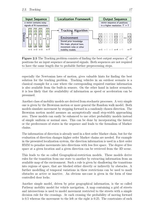 2.3. Tracking 17Figure 2.5 The Tracking problem consists of finding the best output sequence sT1ofpositions for an input sequence of measured signals. Both sequences are not requiredto have the same length due to probable further preprocessing steps.especially the Newtonian laws of motion, gives valuable hints for finding the bestsolution for the tracking problem. Tracking vehicles in an outdoor scenario is aclassical example for a case where the corresponding required runtime informationis also available from the built-in sensors. On the other hand in indoor scenarios,it is less likely that the availability of information as speed or acceleration can bepresumed.Another class of mobility models are derived from stochastic processes. A very simpleone is given by the Brownian motion or more general the Random walk model. Bothmodels simulate movement by stepping forward in a randomly chosen direction. TheBrownian motion model assumes an asymptotically small step-width approachingzero. These models can easily be enhanced to use other probability models insteadof simple uniform or normal ones. This can be done by incorporating the historyor the predecessors of states in the sequence and leads to the formalism of Markov chains.The information of direction is already used in a first order Markov chain, but for theevaluation of direction changes higher order Markov chains are needed. For examplein the presented localization system, the direction information is used in a first orderHMM to penalize movements into directions with less free space. The degree of freespace at a given location and a given direction can be retrieved from the 3D scene.This leads to the so called Geographical-restriction models. These models deriverules for the transition from one state to another by extracting information from anavailable map of the environment. Such a rule is given by disallowing the transitionsinto regions of space, that are blocked either directly or indirectly by obstacles. Afurther modelling of temporal variations in these restrictions can be used to markobstacles as active or inactive. An obvious use-case is given in the form of timecontrolled door locks.Another simple model, driven by prior geographical information, is the so calledPathway mobility model for vehicle navigation. A map containing a grid of streetsand intersections is used to model movement restricted to the streets with a simpledecision rule for the crossings. At each crossing the probability of moving forwardis 0.5 whereas the movement to the left or the right is 0.25. The constraints of such