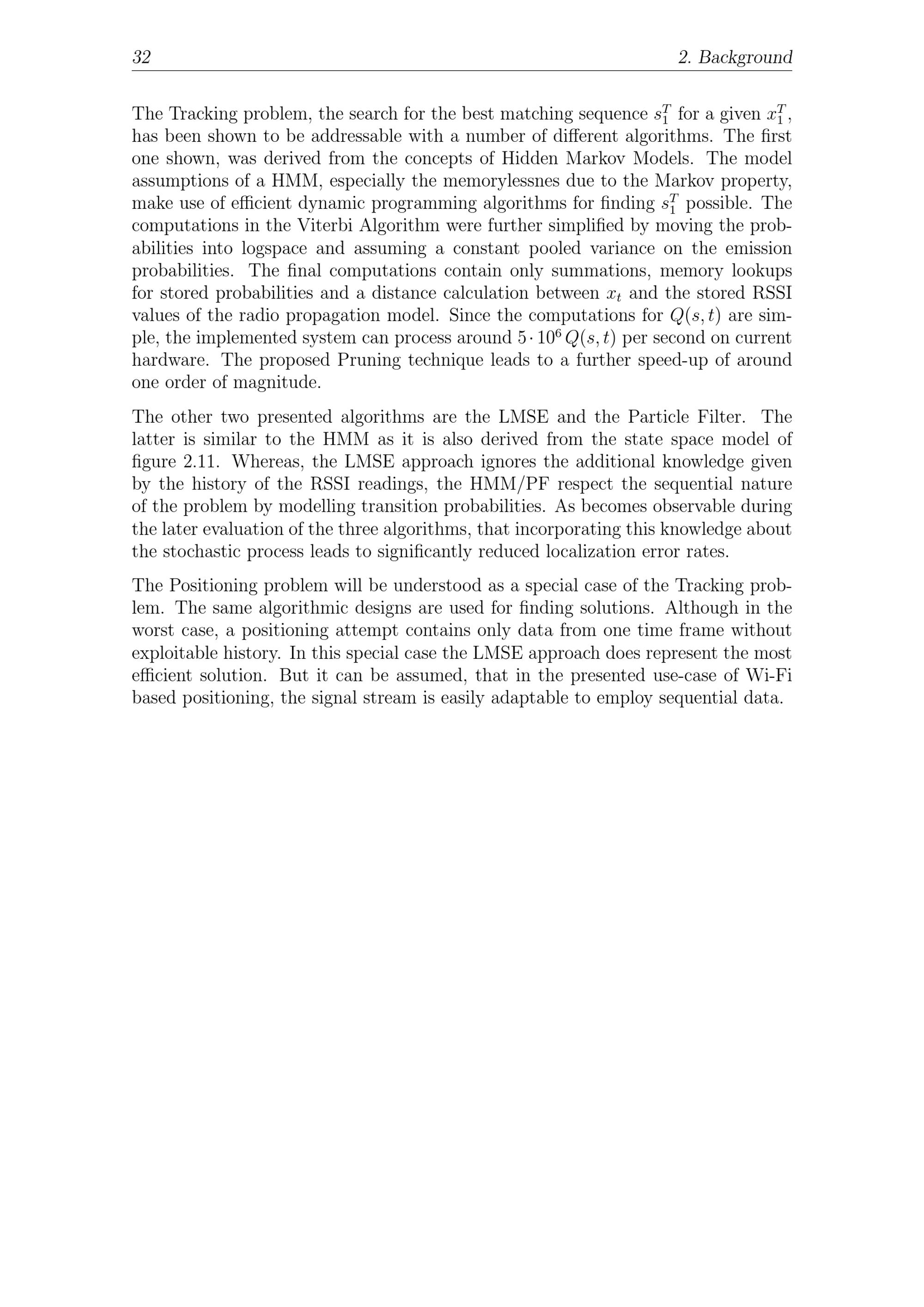 32 2. BackgroundThe Tracking problem, the search for the best matching sequence sT1for a given x1T,has been shown to be addressable with a number of different algorithms. The firstone shown, was derived from the concepts of Hidden Markov Models . The modelassumptions of a HMM , especially the memorylessnes due to the Markov property,make use of efficient dynamic programming algorithms for finding s1Tpossible. Thecomputations in the Viterbi Algorithm were further simplified by moving the prob-abilities into logspace and assuming a constant pooled variance on the emissionprobabilities. The final computations contain only summations, memory lookupsfor stored probabilities and a distance calculation between xtand the stored RSSIvalues of the radio propagation model. Since the computations for Q( s, t) are sim-ple, the implemented system can process around 5 · 106Q( s, t) per second on currenthardware. The proposed Pruning technique leads to a further speed-up of aroundone order of magnitude.The other two presented algorithms are the LMSE and the Particle Filter. Thelatter is similar to the HMM as it is also derived from the state space model offigure 2.11. Whereas, the LMSE approach ignores the additional knowledge givenby the history of the RSSI readings, the HMM/PF respect the sequential natureof the problem by modelling transition probabilities. As becomes observable duringthe later evaluation of the three algorithms, that incorporating this knowledge aboutthe stochastic process leads to significantly reduced localization error rates.The Positioning problem will be understood as a special case of the Tracking prob-lem. The same algorithmic designs are used for finding solutions. Although in theworst case, a positioning attempt contains only data from one time frame withoutexploitable history. In this special case the LMSE approach does represent the mostefficient solution. But it can be assumed, that in the presented use-case of Wi-Fibased positioning, the signal stream is easily adaptable to employ sequential data.