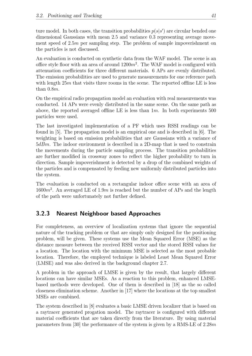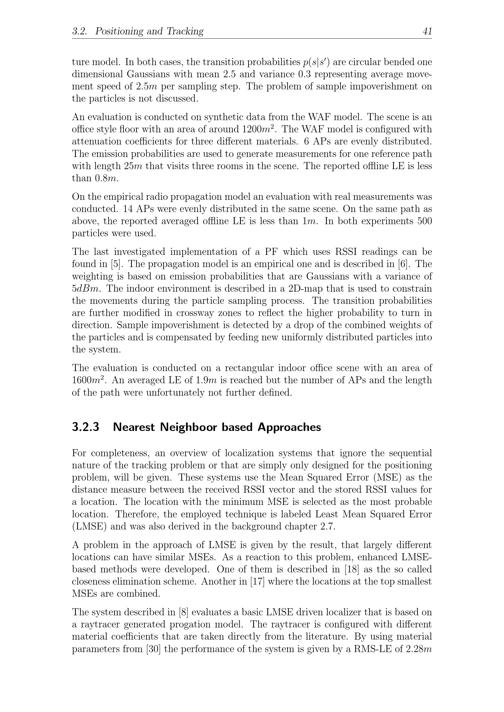 3.2. Positioning and Tracking 41ture model. In both cases, the transition probabilities p( s| s) are circular bended onedimensional Gaussians with mean 2. 5 and variance 0. 3 representing average move-ment speed of 2. 5 m per sampling step. The problem of sample impoverishment onthe particles is not discussed.An evaluation is conducted on synthetic data from the WAF model. The scene is anoffice style floor with an area of around 1200 m2. The WAF model is configured withattenuation coefficients for three different materials. 6 APs are evenly distributed.The emission probabilities are used to generate measurements for one reference pathwith length 25 m that visits three rooms in the scene. The reported offline LE is lessthan 0. 8 m.On the empirical radio propagation model an evaluation with real measurements wasconducted. 14 APs were evenly distributed in the same scene. On the same path asabove, the reported averaged offline LE is less than 1 m. In both experiments 500particles were used.The last investigated implementation of a PF which uses RSSI readings can befound in[5]. The propagation model is an empirical one and is described in[6]. Theweighting is based on emission probabilities that are Gaussians with a variance of5 dBm. The indoor environment is described in a 2D-map that is used to constrainthe movements during the particle sampling process. The transition probabilitiesare further modified in crossway zones to reflect the higher probability to turn indirection. Sample impoverishment is detected by a drop of the combined weights ofthe particles and is compensated by feeding new uniformly distributed particles intothe system.The evaluation is conducted on a rectangular indoor office scene with an area of1600 m2. An averaged LE of 1. 9 m is reached but the number of APs and the lengthof the path were unfortunately not further defined.3.2.3 Nearest Neighboor based ApproachesFor completeness, an overview of localization systems that ignore the sequentialnature of the tracking problem or that are simply only designed for the positioningproblem, will be given. These systems use the Mean Squared Error(MSE) as thedistance measure between the received RSSI vector and the stored RSSI values fora location. The location with the minimum MSE is selected as the most probablelocation. Therefore, the employed technique is labeled Least Mean Squared Error(LMSE) and was also derived in the background chapter 2.7.A problem in the approach of LMSE is given by the result, that largely differentlocations can have similar MSEs. As a reaction to this problem, enhanced LMSE-based methods were developed. One of them is described in[18] as the so calledcloseness elimination scheme. Another in[17] where the locations at the top smallestMSEs are combined.The system described in[8] evaluates a basic LMSE driven localizer that is based ona raytracer generated progation model. The raytracer is configured with differentmaterial coefficients that are taken directly from the literature. By using materialparameters from[30] the performance of the system is given by a RMS-LE of 2. 28 m