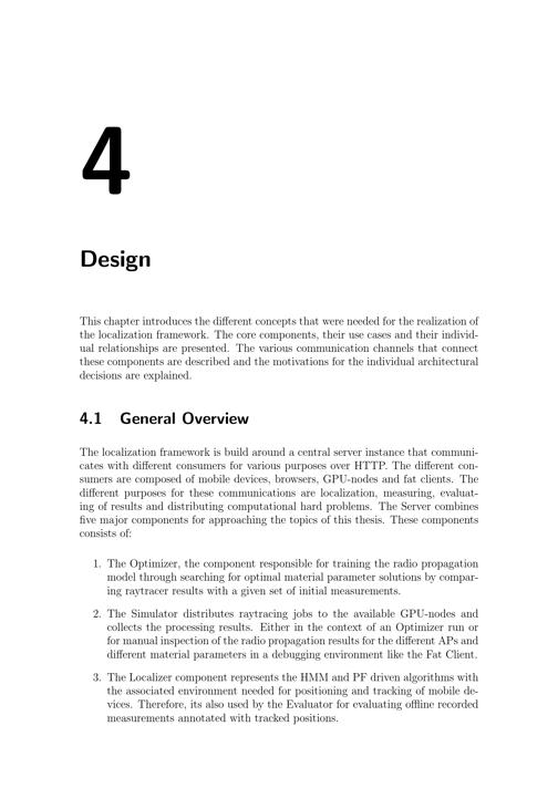 4DesignThis chapter introduces the different concepts that were needed for the realization ofthe localization framework. The core components, their use cases and their individ-ual relationships are presented. The various communication channels that connectthese components are described and the motivations for the individual architecturaldecisions are explained.4.1 General OverviewThe localization framework is build around a central server instance that communi-cates with different consumers for various purposes over HTTP. The different con-sumers are composed of mobile devices, browsers, GPU-nodes and fat clients. Thedifferent purposes for these communications are localization, measuring, evaluat-ing of results and distributing computational hard problems. The Server combinesfive major components for approaching the topics of this thesis. These componentsconsists of:1. The Optimizer, the component responsible for training the radio propagationmodel through searching for optimal material parameter solutions by compar-ing raytracer results with a given set of initial measurements.2. The Simulator distributes raytracing jobs to the available GPU-nodes andcollects the processing results. Either in the context of an Optimizer run orfor manual inspection of the radio propagation results for the different APs anddifferent material parameters in a debugging environment like the Fat Client.3. The Localizer component represents the HMM and PF driven algorithms withthe associated environment needed for positioning and tracking of mobile de-vices. Therefore, its also used by the Evaluator for evaluating offline recordedmeasurements annotated with tracked positions.