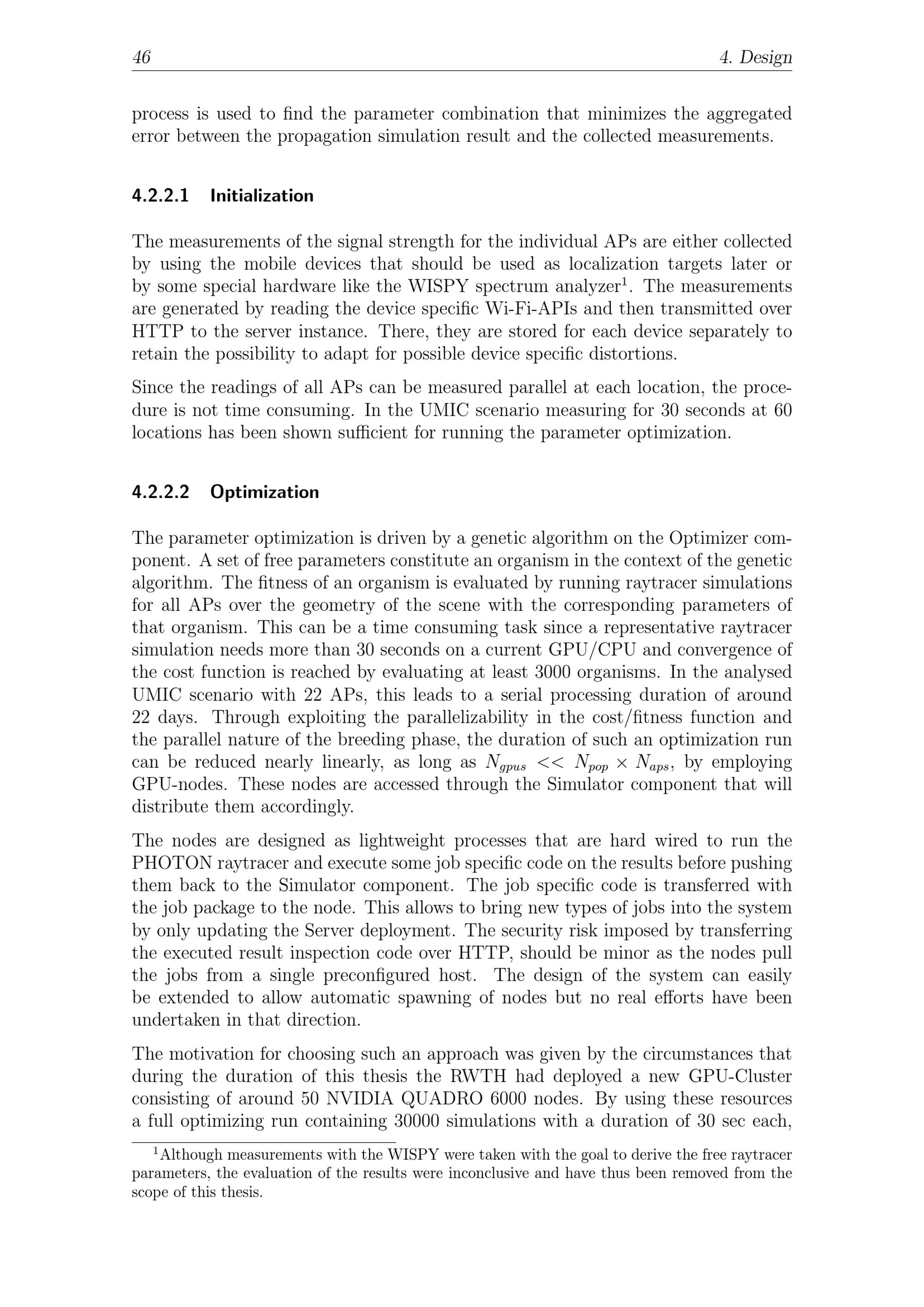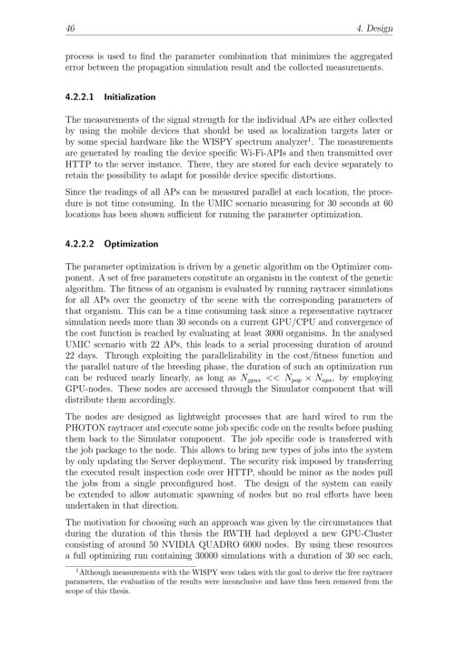 46 4. Designprocess is used to find the parameter combination that minimizes the aggregatederror between the propagation simulation result and the collected measurements.4.2.2.1 InitializationThe measurements of the signal strength for the individual APs are either collectedby using the mobile devices that should be used as localization targets later orby some special hardware like the WISPY spectrum analyzer1. The measurementsare generated by reading the device specific Wi-Fi-APIs and then transmitted overHTTP to the server instance. There, they are stored for each device separately toretain the possibility to adapt for possible device specific distortions.Since the readings of all APs can be measured parallel at each location, the proce-dure is not time consuming. In the UMIC scenario measuring for 30 seconds at 60locations has been shown sufficient for running the parameter optimization.4.2.2.2 OptimizationThe parameter optimization is driven by a genetic algorithm on the Optimizer com-ponent. A set of free parameters constitute an organism in the context of the geneticalgorithm. The fitness of an organism is evaluated by running raytracer simulationsfor all APs over the geometry of the scene with the corresponding parameters ofthat organism. This can be a time consuming task since a representative raytracersimulation needs more than 30 seconds on a current GPU/CPU and convergence ofthe cost function is reached by evaluating at least 3000 organisms. In the analysedUMIC scenario with 22 APs, this leads to a serial processing duration of around22 days. Through exploiting the parallelizability in the cost/fitness function andthe parallel nature of the breeding phase, the duration of such an optimization runcan be reduced nearly linearly, as long as Ngpus<< Npop× Naps, by employingGPU-nodes. These nodes are accessed through the Simulator component that willdistribute them accordingly.The nodes are designed as lightweight processes that are hard wired to run thePHOTON raytracer and execute some job specific code on the results before pushingthem back to the Simulator component. The job specific code is transferred withthe job package to the node. This allows to bring new types of jobs into the systemby only updating the Server deployment. The security risk imposed by transferringthe executed result inspection code over HTTP, should be minor as the nodes pullthe jobs from a single preconfigured host. The design of the system can easilybe extended to allow automatic spawning of nodes but no real efforts have beenundertaken in that direction.The motivation for choosing such an approach was given by the circumstances thatduring the duration of this thesis the RWTH had deployed a new GPU-Clusterconsisting of around 50 NVIDIA QUADRO 6000 nodes. By using these resourcesa full optimizing run containing 30000 simulations with a duration of 30 sec each,1Although measurements with the WISPY were taken with the goal to derive the free raytracerparameters, the evaluation of the results were inconclusive and have thus been removed from thescope of this thesis.