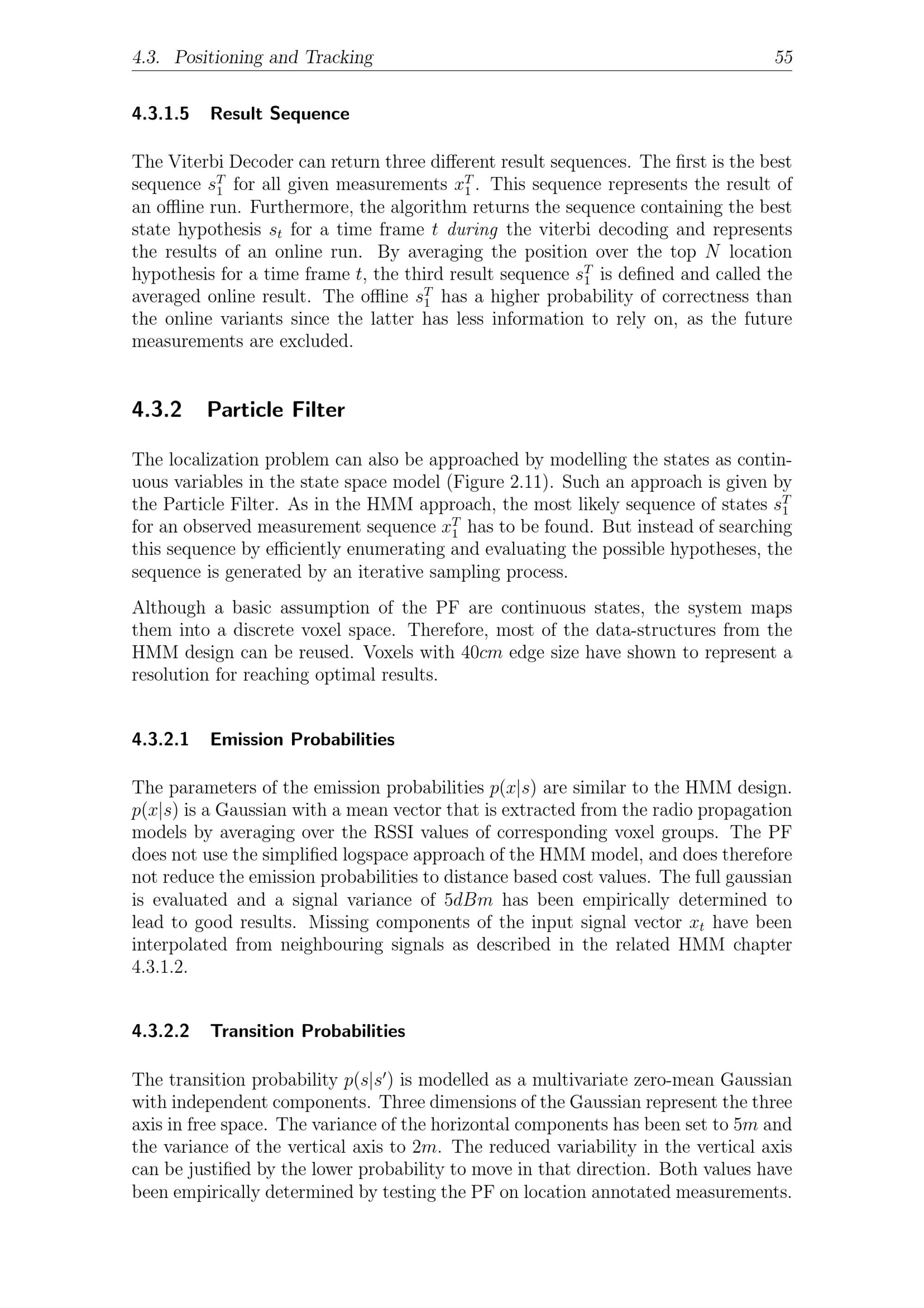 4.3. Positioning and Tracking 554.3.1.5 Result SequenceThe Viterbi Decoder can return three different result sequences. The first is the bestsequence s1Tfor all given measurements x1T. This sequence represents the result ofan offline run. Furthermore, the algorithm returns the sequence containing the beststate hypothesis stfor a time frame t during the viterbi decoding and representsthe results of an online run. By averaging the position over the top N locationhypothesis for a time frame t, the third result sequence sT1is defined and called theaveraged online result. The offline s1Thas a higher probability of correctness thanthe online variants since the latter has less information to rely on, as the futuremeasurements are excluded.4.3.2 Particle FilterThe localization problem can also be approached by modelling the states as contin-uous variables in the state space model(Figure 2.11). Such an approach is given bythe Particle Filter. As in the HMM approach, the most likely sequence of states sT1for an observed measurement sequence x1Thas to be found. But instead of searchingthis sequence by efficiently enumerating and evaluating the possible hypotheses, thesequence is generated by an iterative sampling process.Although a basic assumption of the PF are continuous states, the system mapsthem into a discrete voxel space. Therefore, most of the data-structures from theHMM design can be reused. Voxels with 40 cm edge size have shown to represent aresolution for reaching optimal results.4.3.2.1 Emission ProbabilitiesThe parameters of the emission probabilities p( x| s) are similar to the HMM design.p( x| s) is a Gaussian with a mean vector that is extracted from the radio propagationmodels by averaging over the RSSI values of corresponding voxel groups. The PFdoes not use the simplified logspace approach of the HMM model, and does thereforenot reduce the emission probabilities to distance based cost values. The full gaussianis evaluated and a signal variance of 5 dBm has been empirically determined tolead to good results. Missing components of the input signal vector xthave beeninterpolated from neighbouring signals as described in the related HMM chapter4.3.1.2.4.3.2.2 Transition ProbabilitiesThe transition probability p( s| s) is modelled as a multivariate zero-mean Gaussianwith independent components. Three dimensions of the Gaussian represent the threeaxis in free space. The variance of the horizontal components has been set to 5 m andthe variance of the vertical axis to 2 m. The reduced variability in the vertical axiscan be justified by the lower probability to move in that direction. Both values havebeen empirically determined by testing the PF on location annotated measurements.