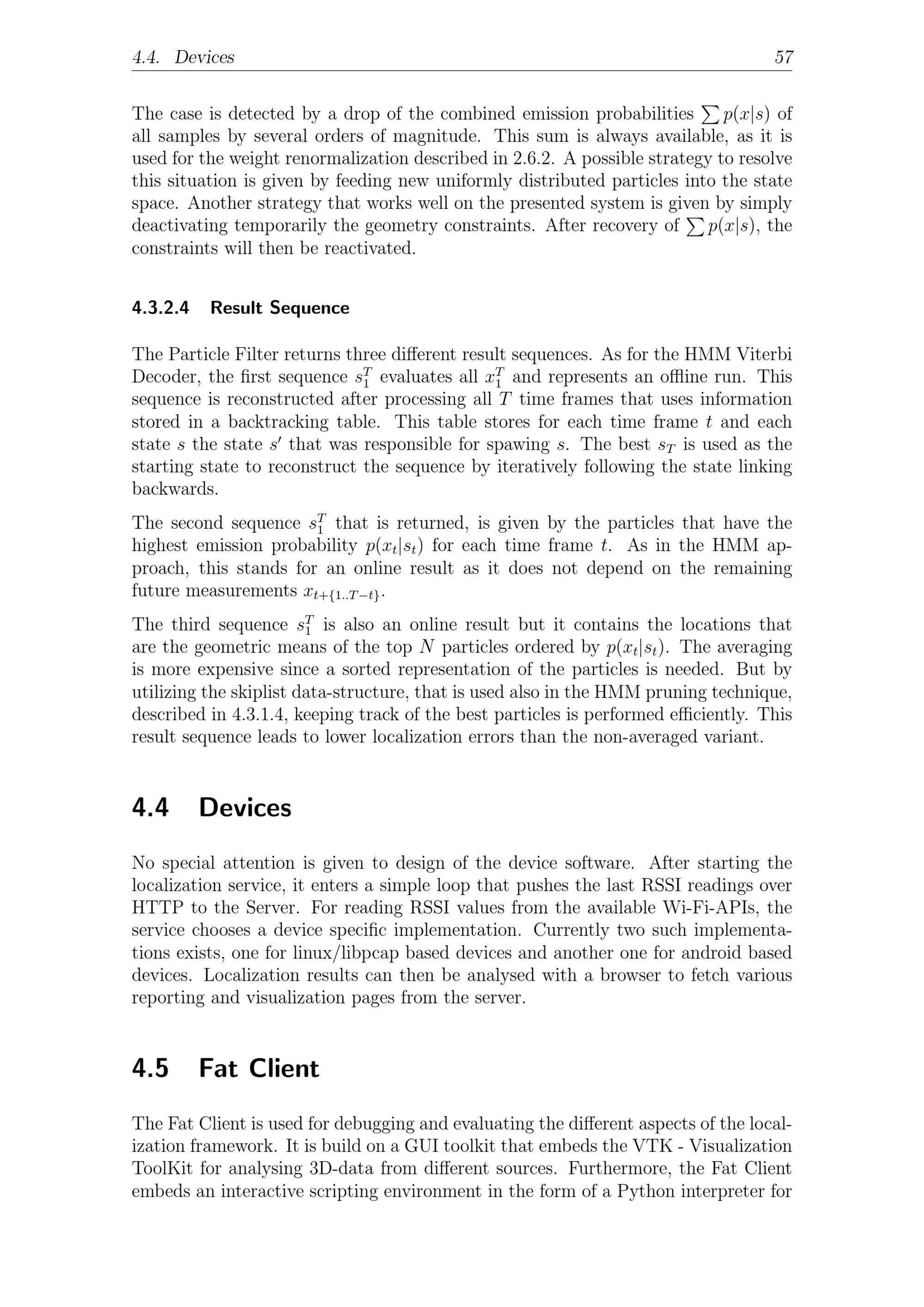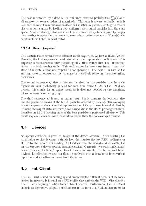 4.4. Devices 57The case is detected by a drop of the combined emission probabilities p( x| s) ofall samples by several orders of magnitude. This sum is always available, as it isused for the weight renormalization described in 2.6.2. A possible strategy to resolvethis situation is given by feeding new uniformly distributed particles into the statespace. Another strategy that works well on the presented system is given by simplydeactivating temporarily the geometry constraints. After recovery of p( x| s), theconstraints will then be reactivated.4.3.2.4 Result SequenceThe Particle Filter returns three different result sequences. As for the HMM ViterbiDecoder, the first sequence sT1evaluates all x1Tand represents an offline run. Thissequence is reconstructed after processing all T time frames that uses informationstored in a backtracking table. This table stores for each time frame t and eachstate s the state s that was responsible for spawing s. The best sTis used as thestarting state to reconstruct the sequence by iteratively following the state linkingbackwards.The second sequence s1Tthat is returned, is given by the particles that have thehighest emission probability p( xt| st) for each time frame t. As in the HMM ap-proach, this stands for an online result as it does not depend on the remainingfuture measurements xt+{ 1..T- t}.The third sequence sT1is also an online result but it contains the locations thatare the geometric means of the top N particles ordered by p( xt| st). The averagingis more expensive since a sorted representation of the particles is needed. But byutilizing the skiplist data-structure, that is used also in the HMM pruning technique,described in 4.3.1.4, keeping track of the best particles is performed efficiently. Thisresult sequence leads to lower localization errors than the non-averaged variant.4.4 DevicesNo special attention is given to design of the device software. After starting thelocalization service, it enters a simple loop that pushes the last RSSI readings overHTTP to the Server. For reading RSSI values from the available Wi-Fi-APIs, theservice chooses a device specific implementation. Currently two such implementa-tions exists, one for linux/libpcap based devices and another one for android baseddevices. Localization results can then be analysed with a browser to fetch variousreporting and visualization pages from the server.4.5 Fat ClientThe Fat Client is used for debugging and evaluating the different aspects of the local-ization framework. It is build on a GUI toolkit that embeds the VTK- VisualizationToolKit for analysing 3D-data from different sources. Furthermore, the Fat Clientembeds an interactive scripting environment in the form of a Python interpreter for