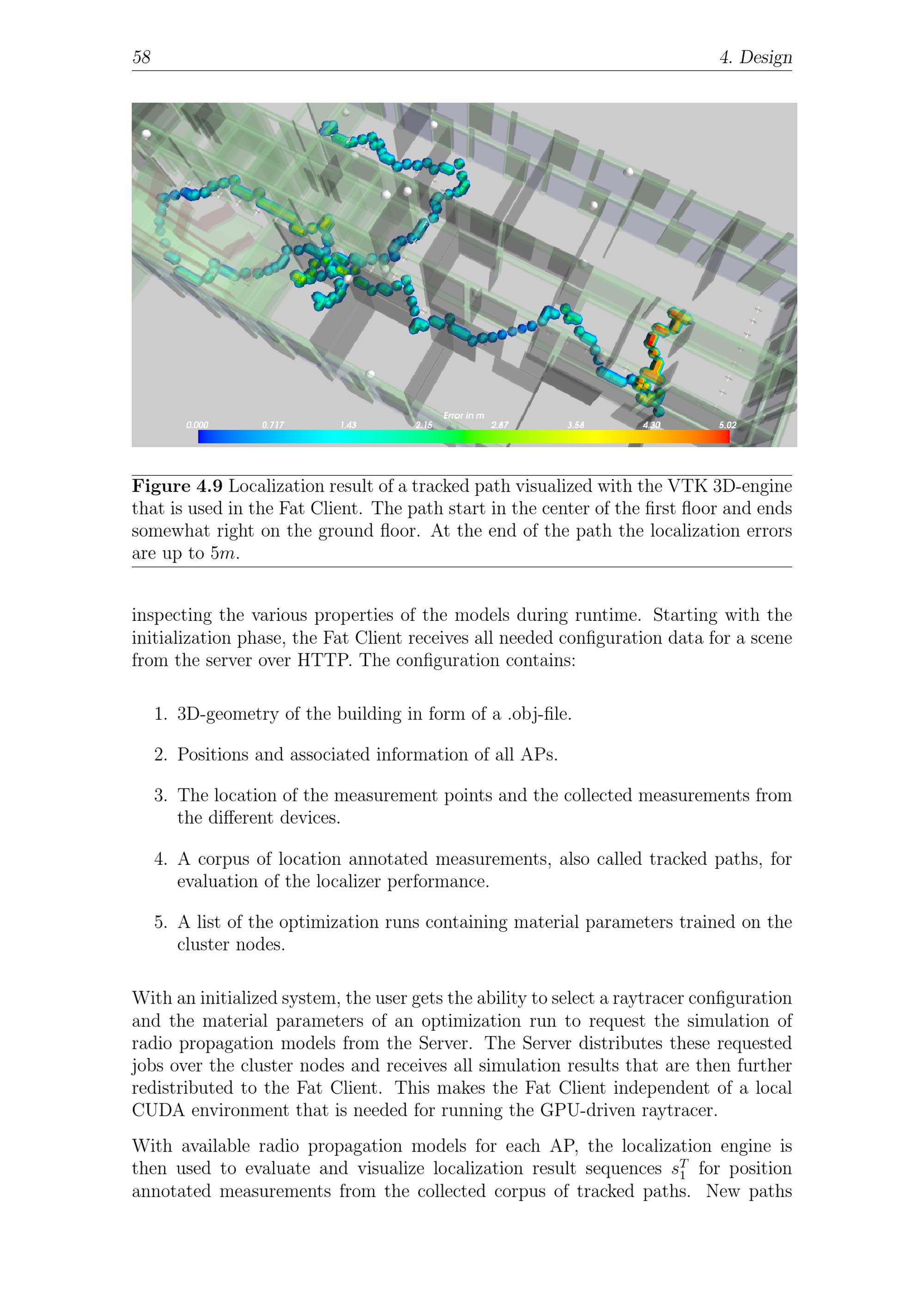 58 4. DesignFigure 4.9 Localization result of a tracked path visualized with the VTK 3D-enginethat is used in the Fat Client. The path start in the center of the first floor and endssomewhat right on the ground floor. At the end of the path the localization errorsare up to 5 m.inspecting the various properties of the models during runtime. Starting with theinitialization phase, the Fat Client receives all needed configuration data for a scenefrom the server over HTTP. The configuration contains:1. 3D-geometry of the building in form of a.obj-file.2. Positions and associated information of all APs.3. The location of the measurement points and the collected measurements fromthe different devices.4. A corpus of location annotated measurements, also called tracked paths, forevaluation of the localizer performance.5. A list of the optimization runs containing material parameters trained on thecluster nodes.With an initialized system, the user gets the ability to select a raytracer configurationand the material parameters of an optimization run to request the simulation ofradio propagation models from the Server. The Server distributes these requestedjobs over the cluster nodes and receives all simulation results that are then furtherredistributed to the Fat Client. This makes the Fat Client independent of a localCUDA environment that is needed for running the GPU-driven raytracer.With available radio propagation models for each AP, the localization engine isthen used to evaluate and visualize localization result sequences sT1for positionannotated measurements from the collected corpus of tracked paths. New paths