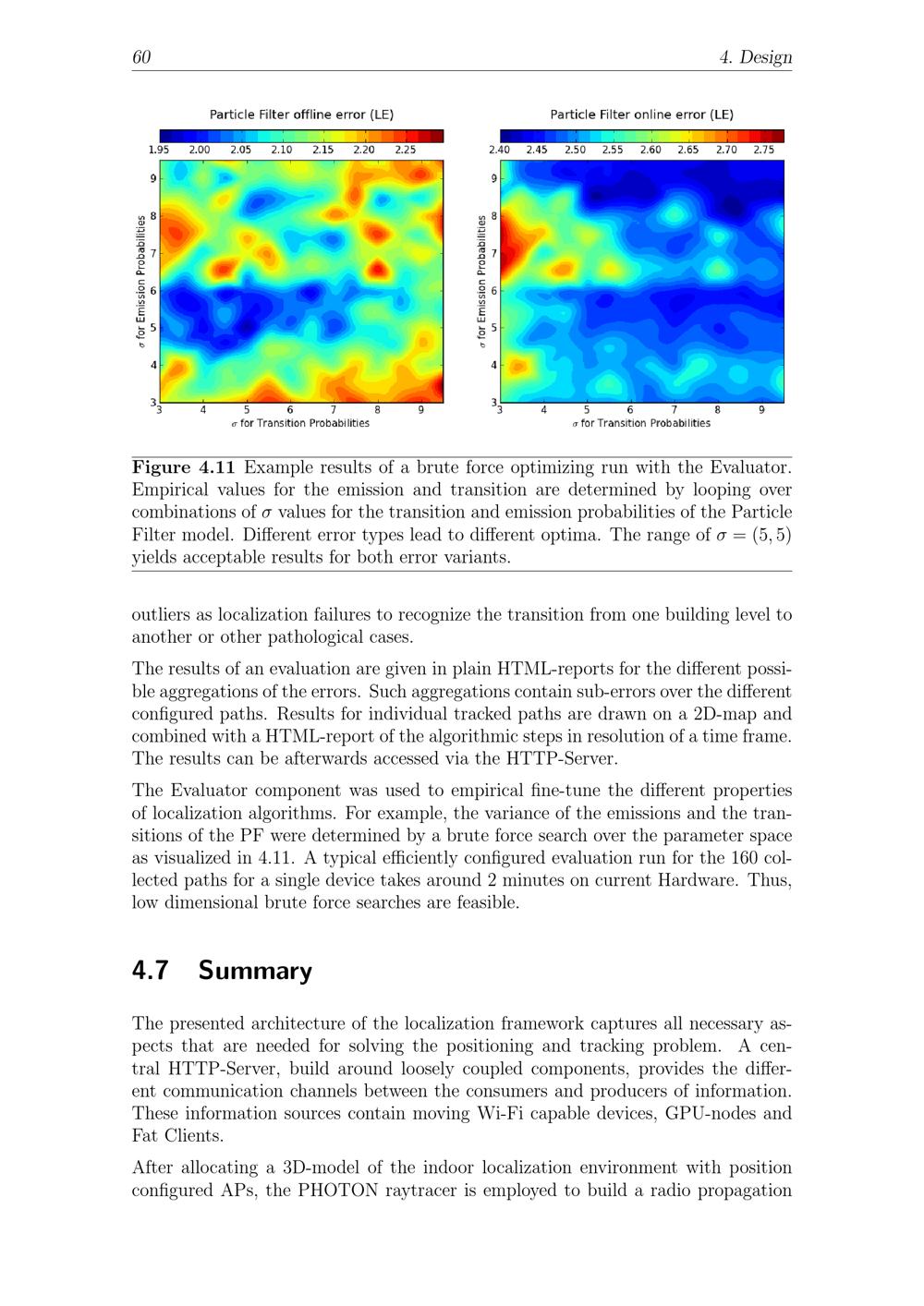 60 4. DesignFigure 4.11 Example results of a brute force optimizing run with the Evaluator.Empirical values for the emission and transition are determined by looping overcombinations of values for the transition and emission probabilities of the ParticleFilter model. Different error types lead to different optima. The range of =(5, 5)yields acceptable results for both error variants.outliers as localization failures to recognize the transition from one building level toanother or other pathological cases.The results of an evaluation are given in plain HTML-reports for the different possi-ble aggregations of the errors. Such aggregations contain sub-errors over the differentconfigured paths. Results for individual tracked paths are drawn on a 2D-map andcombined with a HTML-report of the algorithmic steps in resolution of a time frame.The results can be afterwards accessed via the HTTP-Server.The Evaluator component was used to empirical fine-tune the different propertiesof localization algorithms. For example, the variance of the emissions and the tran-sitions of the PF were determined by a brute force search over the parameter spaceas visualized in 4.11. A typical efficiently configured evaluation run for the 160 col-lected paths for a single device takes around 2 minutes on current Hardware. Thus,low dimensional brute force searches are feasible.4.7 SummaryThe presented architecture of the localization framework captures all necessary as-pects that are needed for solving the positioning and tracking problem. A cen-tral HTTP-Server, build around loosely coupled components, provides the differ-ent communication channels between the consumers and producers of information.These information sources contain moving Wi-Fi capable devices, GPU-nodes andFat Clients.After allocating a 3D-model of the indoor localization environment with positionconfigured APs, the PHOTON raytracer is employed to build a radio propagation