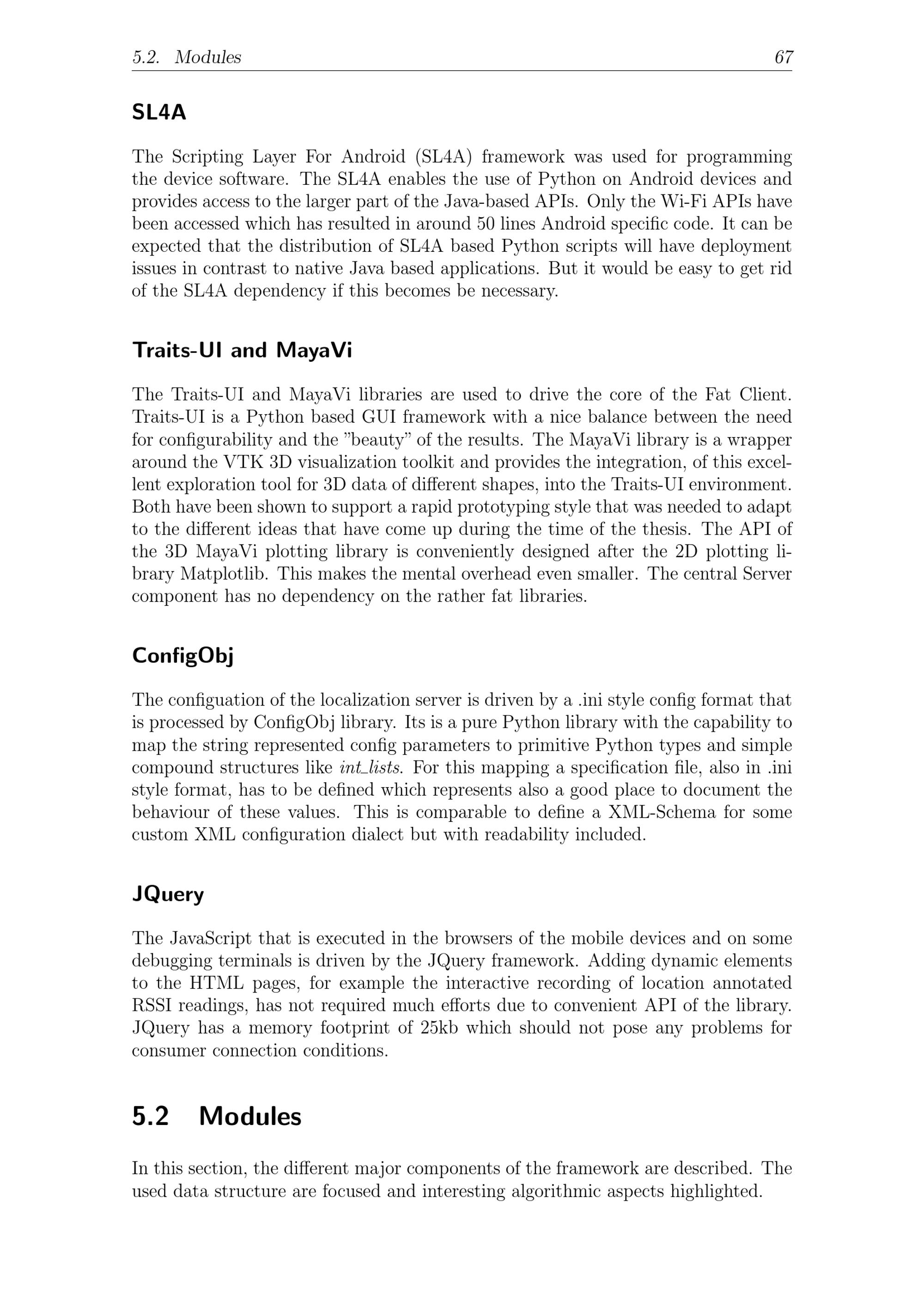 5.2. Modules 67SL4AThe Scripting Layer For Android(SL4A) framework was used for programmingthe device software. The SL4A enables the use of Python on Android devices andprovides access to the larger part of the Java -based APIs. Only the Wi-Fi APIs havebeen accessed which has resulted in around 50 lines Android specific code. It can beexpected that the distribution of SL4A based Python scripts will have deploymentissues in contrast to native Java based applications. But it would be easy to get ridof the SL4A dependency if this becomes be necessary.Traits-UI and MayaViThe Traits-UI and MayaVi libraries are used to drive the core of the Fat Client.Traits-UI is a Python based GUI framework with a nice balance between the needfor configurability and the"beauty" of the results. The MayaVi library is a wrapperaround the VTK 3D visualization toolkit and provides the integration, of this excel-lent exploration tool for 3D data of different shapes, into the Traits-UI environment.Both have been shown to support a rapid prototyping style that was needed to adaptto the different ideas that have come up during the time of the thesis. The API ofthe 3D MayaVi plotting library is conveniently designed after the 2D plotting li-brary Matplotlib. This makes the mental overhead even smaller. The central Servercomponent has no dependency on the rather fat libraries.ConfigObjThe configuation of the localization server is driven by a.ini style config format thatis processed by ConfigObj library. Its is a pure Python library with the capability tomap the string represented config parameters to primitive Python types and simplecompound structures like intlists. For this mapping a specification file, also in.inistyle format, has to be defined which represents also a good place to document thebehaviour of these values. This is comparable to define a XML-Schema for somecustom XML configuration dialect but with readability included.JQuery The JavaScript that is executed in the browsers of the mobile devices and on somedebugging terminals is driven by the JQuery framework. Adding dynamic elementsto the HTML pages, for example the interactive recording of location annotatedRSSI readings, has not required much efforts due to convenient API of the library.JQuery has a memory footprint of 25kb which should not pose any problems forconsumer connection conditions.5.2 ModulesIn this section, the different major components of the framework are described. Theused data structure are focused and interesting algorithmic aspects highlighted.