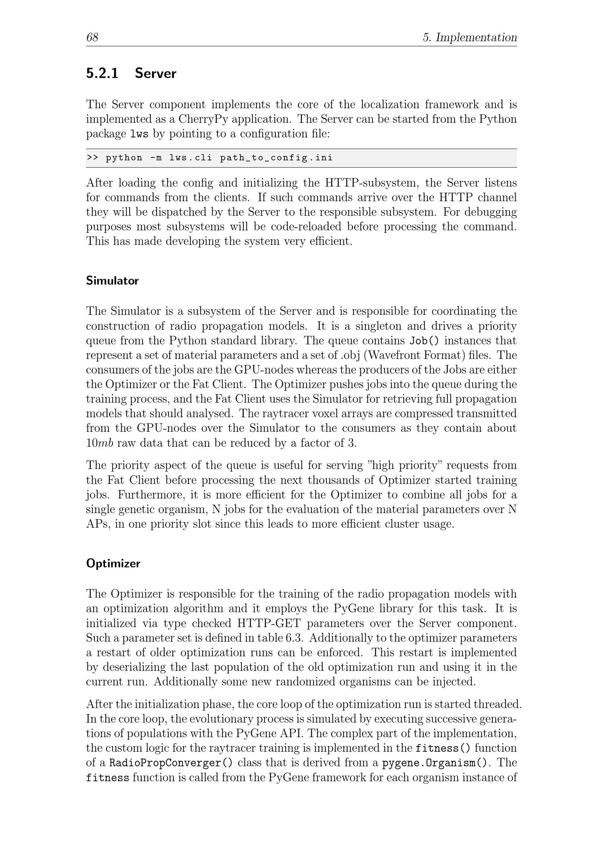68 5. Implementation5.2.1 ServerThe Server component implements the core of the localization framework and isimplemented as a CherryPy application. The Server can be started from the Python packagelwsby pointing to a configuration file:>> python-m lws.cli path_to_config.iniAfter loading the config and initializing the HTTP-subsystem, the Server listensfor commands from the clients. If such commands arrive over the HTTP channelthey will be dispatched by the Server to the responsible subsystem. For debuggingpurposes most subsystems will be code-reloaded before processing the command.This has made developing the system very efficient.SimulatorThe Simulator is a subsystem of the Server and is responsible for coordinating theconstruction of radio propagation models. It is a singleton and drives a priorityqueue from the Python standard library. The queue containsJob()instances thatrepresent a set of material parameters and a set of.obj(Wavefront Format) files. Theconsumers of the jobs are the GPU-nodes whereas the producers of the Jobs are eitherthe Optimizer or the Fat Client. The Optimizer pushes jobs into the queue during thetraining process, and the Fat Client uses the Simulator for retrieving full propagationmodels that should analysed. The raytracer voxel arrays are compressed transmittedfrom the GPU-nodes over the Simulator to the consumers as they contain about10 mb raw data that can be reduced by a factor of 3.The priority aspect of the queue is useful for serving"high priority" requests fromthe Fat Client before processing the next thousands of Optimizer started trainingjobs. Furthermore, it is more efficient for the Optimizer to combine all jobs for asingle genetic organism, N jobs for the evaluation of the material parameters over NAPs, in one priority slot since this leads to more efficient cluster usage.OptimizerThe Optimizer is responsible for the training of the radio propagation models withan optimization algorithm and it employs the PyGene library for this task. It isinitialized via type checked HTTP-GET parameters over the Server component.Such a parameter set is defined in table 6.3. Additionally to the optimizer parametersa restart of older optimization runs can be enforced. This restart is implementedby deserializing the last population of the old optimization run and using it in thecurrent run. Additionally some new randomized organisms can be injected.After the initialization phase, the core loop of the optimization run is started threaded.In the core loop, the evolutionary process is simulated by executing successive genera-tions of populations with the PyGene API. The complex part of the implementation,the custom logic for the raytracer training is implemented in thefitness()functionof aRadioPropConverger()class that is derived from apygene.Organism(). Thefitnessfunction is called from the PyGene framework for each organism instance of