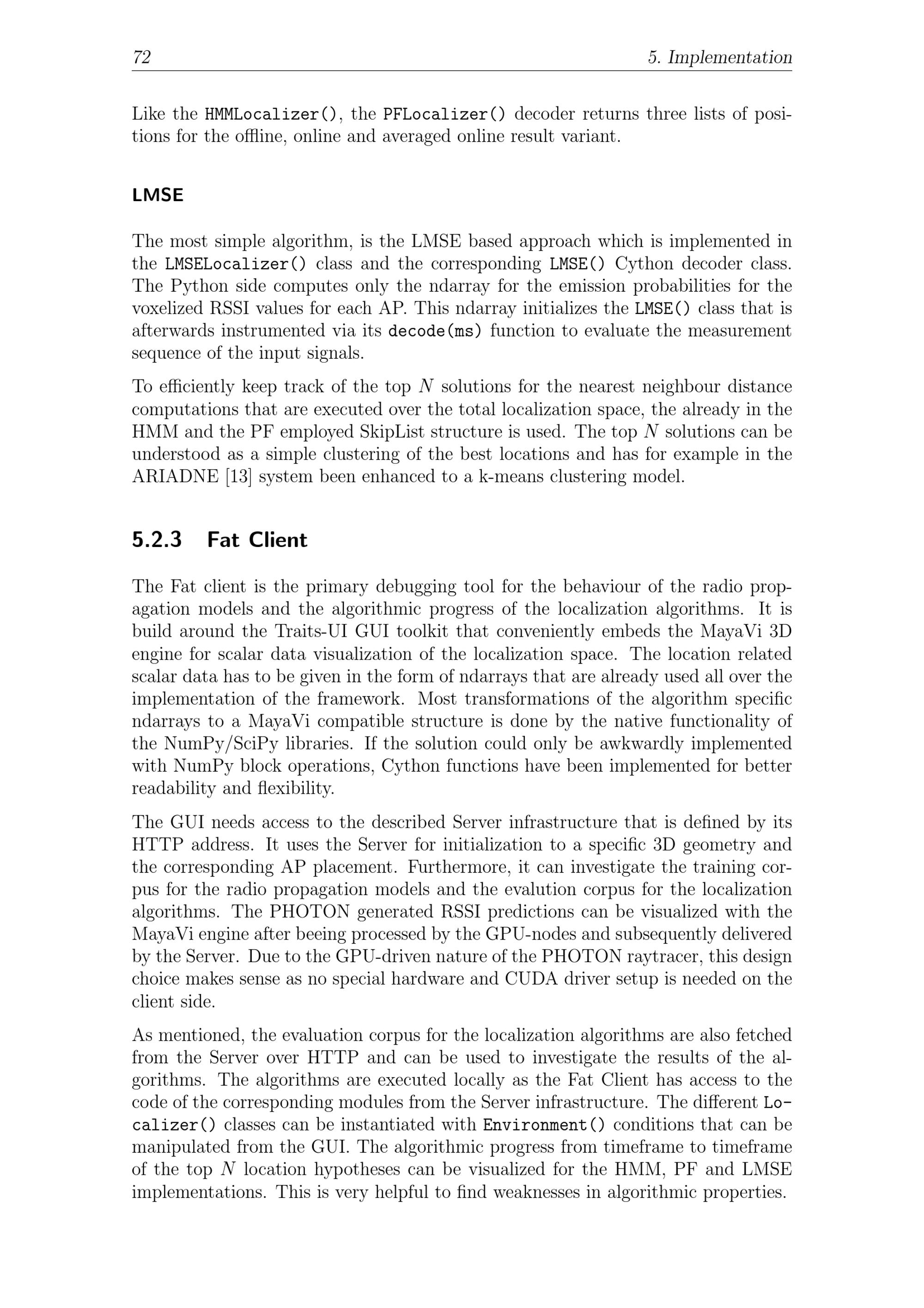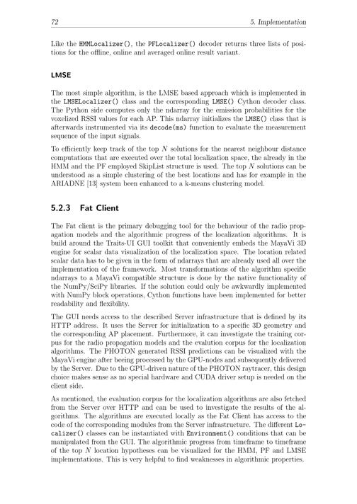 72 5. ImplementationLike theHMMLocalizer(), thePFLocalizer()decoder returns three lists of posi-tions for the offline, online and averaged online result variant.LMSEThe most simple algorithm, is the LMSE based approach which is implemented intheLMSELocalizer()class and the correspondingLMSE()Cython decoder class.The Python side computes only the ndarray for the emission probabilities for thevoxelized RSSI values for each AP. This ndarray initializes theLMSE()class that isafterwards instrumented via itsdecode(ms)function to evaluate the measurementsequence of the input signals.To efficiently keep track of the top N solutions for the nearest neighbour distancecomputations that are executed over the total localization space, the already in theHMM and the PF employed SkipList structure is used. The top N solutions can beunderstood as a simple clustering of the best locations and has for example in theARIADNE [13] system been enhanced to a k-means clustering model.5.2.3 Fat ClientThe Fat client is the primary debugging tool for the behaviour of the radio prop-agation models and the algorithmic progress of the localization algorithms. It isbuild around the Traits-UI GUI toolkit that conveniently embeds the MayaVi 3Dengine for scalar data visualization of the localization space. The location relatedscalar data has to be given in the form of ndarrays that are already used all over theimplementation of the framework. Most transformations of the algorithm specificndarrays to a MayaVi compatible structure is done by the native functionality ofthe NumPy/SciPy libraries. If the solution could only be awkwardly implementedwith NumPy block operations, Cython functions have been implemented for betterreadability and flexibility.The GUI needs access to the described Server infrastructure that is defined by itsHTTP address. It uses the Server for initialization to a specific 3D geometry andthe corresponding AP placement. Furthermore, it can investigate the training cor-pus for the radio propagation models and the evalution corpus for the localizationalgorithms. The PHOTON generated RSSI predictions can be visualized with theMayaVi engine after beeing processed by the GPU-nodes and subsequently deliveredby the Server. Due to the GPU-driven nature of the PHOTON raytracer, this designchoice makes sense as no special hardware and CUDA driver setup is needed on theclient side.As mentioned, the evaluation corpus for the localization algorithms are also fetchedfrom the Server over HTTP and can be used to investigate the results of the al-gorithms. The algorithms are executed locally as the Fat Client has access to thecode of the corresponding modules from the Server infrastructure. The differentLo-calizer()classes can be instantiated withEnvironment()conditions that can bemanipulated from the GUI. The algorithmic progress from timeframe to timeframeof the top N location hypotheses can be visualized for the HMM, PF and LMSEimplementations. This is very helpful to find weaknesses in algorithmic properties.