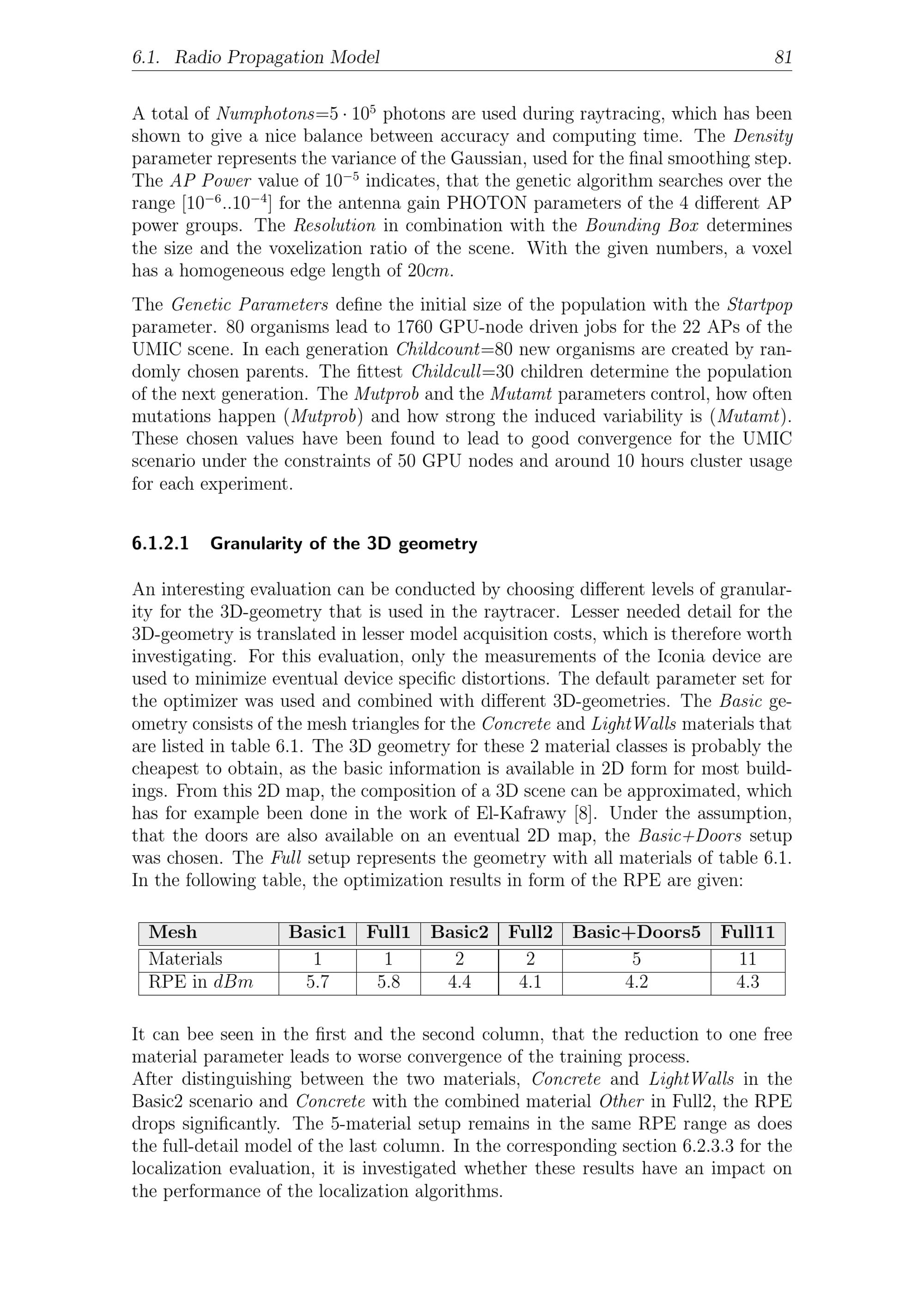 6.1. Radio Propagation Model 81A total of Numphotons=5 · 105photons are used during raytracing, which has beenshown to give a nice balance between accuracy and computing time. The Densityparameter represents the variance of the Gaussian, used for the final smoothing step.The AP Power value of 10- 5indicates, that the genetic algorithm searches over therange[10- 6.. 10- 4] for the antenna gain PHOTON parameters of the 4 different AP power groups. The Resolution in combination with the Bounding Box determinesthe size and the voxelization ratio of the scene. With the given numbers, a voxelhas a homogeneous edge length of 20 cm.The Genetic Parameters define the initial size of the population with the Startpopparameter. 80 organisms lead to 1760 GPU-node driven jobs for the 22 APs of theUMIC scene. In each generation Childcount=80 new organisms are created by ran-domly chosen parents. The fittest Childcull=30 children determine the populationof the next generation. The Mutprob and the Mutamt parameters control, how oftenmutations happen( Mutprob) and how strong the induced variability is( Mutamt).These chosen values have been found to lead to good convergence for the UMICscenario under the constraints of 50 GPU nodes and around 10 hours cluster usagefor each experiment.6.1.2.1 Granularity of the 3D geometryAn interesting evaluation can be conducted by choosing different levels of granular-ity for the 3D-geometry that is used in the raytracer. Lesser needed detail for the3D-geometry is translated in lesser model acquisition costs, which is therefore worthinvestigating. For this evaluation, only the measurements of the Iconia device areused to minimize eventual device specific distortions. The default parameter set forthe optimizer was used and combined with different 3D-geometries. The Basic ge-ometry consists of the mesh triangles for the Concrete and LightWalls materials thatare listed in table 6.1. The 3D geometry for these 2 material classes is probably thecheapest to obtain, as the basic information is available in 2D form for most build-ings. From this 2D map, the composition of a 3D scene can be approximated, whichhas for example been done in the work of El-Kafrawy[8]. Under the assumption,that the doors are also available on an eventual 2D map, the Basic+Doors setupwas chosen. The Full setup represents the geometry with all materials of table 6.1.In the following table, the optimization results in form of the RPE are given:MeshMaterialsRPE in dBmBasic1 Full1 Basic2 Full2 Basic+Doors5 Full1111225.7 5.8 4.4 4.154.2114.3It can bee seen in the first and the second column, that the reduction to one freematerial parameter leads to worse convergence of the training process.After distinguishing between the two materials, Concrete and LightWalls in theBasic2 scenario and Concrete with the combined material Other in Full2, the RPEdrops significantly. The 5-material setup remains in the same RPE range as doesthe full-detail model of the last column. In the corresponding section 6.2.3.3 for thelocalization evaluation, it is investigated whether these results have an impact onthe performance of the localization algorithms.