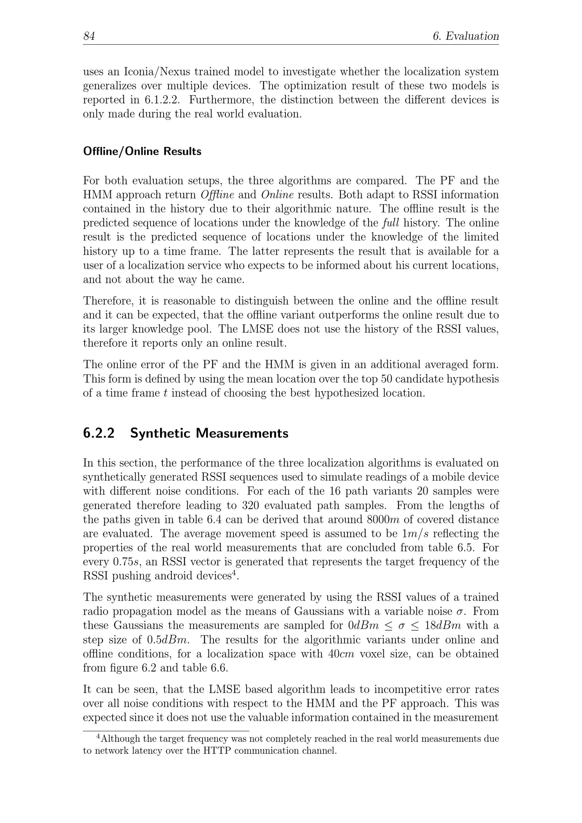 84 6. Evaluationuses an Iconia/Nexus trained model to investigate whether the localization systemgeneralizes over multiple devices. The optimization result of these two models isreported in 6.1.2.2. Furthermore, the distinction between the different devices isonly made during the real world evaluation.Offline/Online ResultsFor both evaluation setups, the three algorithms are compared. The PF and theHMM approach return Offline and Online results. Both adapt to RSSI informationcontained in the history due to their algorithmic nature. The offline result is thepredicted sequence of locations under the knowledge of the full history. The onlineresult is the predicted sequence of locations under the knowledge of the limitedhistory up to a time frame. The latter represents the result that is available for auser of a localization service who expects to be informed about his current locations,and not about the way he came.Therefore, it is reasonable to distinguish between the online and the offline resultand it can be expected, that the offline variant outperforms the online result due toits larger knowledge pool. The LMSE does not use the history of the RSSI values,therefore it reports only an online result.The online error of the PF and the HMM is given in an additional averaged form.This form is defined by using the mean location over the top 50 candidate hypothesisof a time frame t instead of choosing the best hypothesized location.6.2.2 Synthetic MeasurementsIn this section, the performance of the three localization algorithms is evaluated onsynthetically generated RSSI sequences used to simulate readings of a mobile devicewith different noise conditions. For each of the 16 path variants 20 samples weregenerated therefore leading to 320 evaluated path samples. From the lengths ofthe paths given in table 6.4 can be derived that around 8000 m of covered distanceare evaluated. The average movement speed is assumed to be 1 m/s reflecting theproperties of the real world measurements that are concluded from table 6.5. Forevery 0. 75 s, an RSSI vector is generated that represents the target frequency of theRSSI pushing android devices4.The synthetic measurements were generated by using the RSSI values of a trainedradio propagation model as the means of Gaussians with a variable noise . Fromthese Gaussians the measurements are sampled for 0 dBm 18 dBm with astep size of 0. 5 dBm. The results for the algorithmic variants under online andoffline conditions, for a localization space with 40 cm voxel size, can be obtainedfrom figure 6.2 and table 6.6.It can be seen, that the LMSE based algorithm leads to incompetitive error ratesover all noise conditions with respect to the HMM and the PF approach. This wasexpected since it does not use the valuable information contained in the measurement4Although the target frequency was not completely reached in the real world measurements dueto network latency over the HTTP communication channel.
