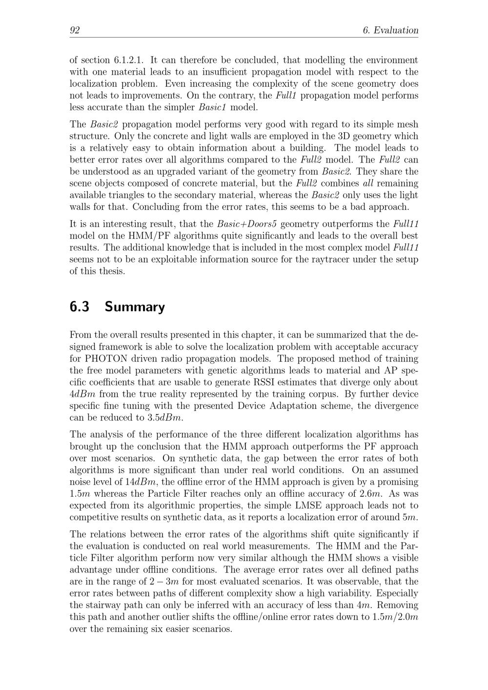 92 6. Evaluationof section 6.1.2.1. It can therefore be concluded, that modelling the environmentwith one material leads to an insufficient propagation model with respect to thelocalization problem. Even increasing the complexity of the scene geometry doesnot leads to improvements. On the contrary, the Full1 propagation model performsless accurate than the simpler Basic1 model.The Basic2 propagation model performs very good with regard to its simple meshstructure. Only the concrete and light walls are employed in the 3D geometry whichis a relatively easy to obtain information about a building. The model leads tobetter error rates over all algorithms compared to the Full2 model. The Full2 canbe understood as an upgraded variant of the geometry from Basic2. They share thescene objects composed of concrete material, but the Full2 combines all remainingavailable triangles to the secondary material, whereas the Basic2 only uses the lightwalls for that. Concluding from the error rates, this seems to be a bad approach.It is an interesting result, that the Basic+Doors5 geometry outperforms the Full11model on the HMM/PF algorithms quite significantly and leads to the overall bestresults. The additional knowledge that is included in the most complex model Full11seems not to be an exploitable information source for the raytracer under the setupof this thesis.6.3 SummaryFrom the overall results presented in this chapter, it can be summarized that the de-signed framework is able to solve the localization problem with acceptable accuracyfor PHOTON driven radio propagation models. The proposed method of trainingthe free model parameters with genetic algorithms leads to material and AP spe-cific coefficients that are usable to generate RSSI estimates that diverge only about4 dBm from the true reality represented by the training corpus. By further devicespecific fine tuning with the presented Device Adaptation scheme, the divergencecan be reduced to 3. 5 dBm.The analysis of the performance of the three different localization algorithms hasbrought up the conclusion that the HMM approach outperforms the PF approachover most scenarios. On synthetic data, the gap between the error rates of bothalgorithms is more significant than under real world conditions. On an assumednoise level of 14 dBm, the offline error of the HMM approach is given by a promising1. 5 m whereas the Particle Filter reaches only an offline accuracy of 2. 6 m. As wasexpected from its algorithmic properties, the simple LMSE approach leads not tocompetitive results on synthetic data, as it reports a localization error of around 5 m.The relations between the error rates of the algorithms shift quite significantly ifthe evaluation is conducted on real world measurements. The HMM and the Par-ticle Filter algorithm perform now very similar although the HMM shows a visibleadvantage under offline conditions. The average error rates over all defined pathsare in the range of 2- 3 m for most evaluated scenarios. It was observable, that theerror rates between paths of different complexity show a high variability. Especiallythe stairway path can only be inferred with an accuracy of less than 4 m. Removingthis path and another outlier shifts the offline/online error rates down to 1. 5 m/ 2. 0 mover the remaining six easier scenarios.